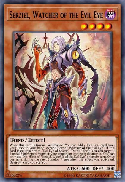 When this card is Normal Summoned: You can add 1 “Evil Eye” card from your Deck to your hand, except “Serziel, Watcher of the Evil Eye”. If this card is equipped with “Evil Eye of Selene” (Quick Effect): You can target 1 Special Summoned monster your opponent controls; destroy it. You can only use this effect of “Serziel, Watcher of the Evil Eye” once per turn. Once per turn, during the next Standby Phase after this effect was activated: Destroy 1 card you control.