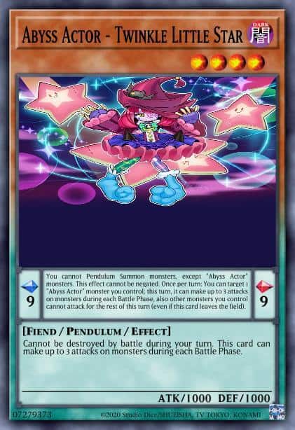 You cannot Pendulum Summon monsters, except “Abyss Actor” monsters. This effect cannot be negated. Once per turn: You can target 1 “Abyss Actor” monster you control; this turn, it can make up to 3 attacks on monsters during each Battle Phase, also other monsters you control cannot attack for the rest of this turn (even if this card leaves the field).