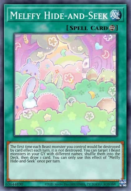 The first time each Beast monster you control would be destroyed by card effect each turn, it is not destroyed. You can target 3 Beast monsters in your GY with different names; shuffle them into the Deck, then draw 1 card. You can only use this effect of “Melffy Hide-and-Seek” once per turn.