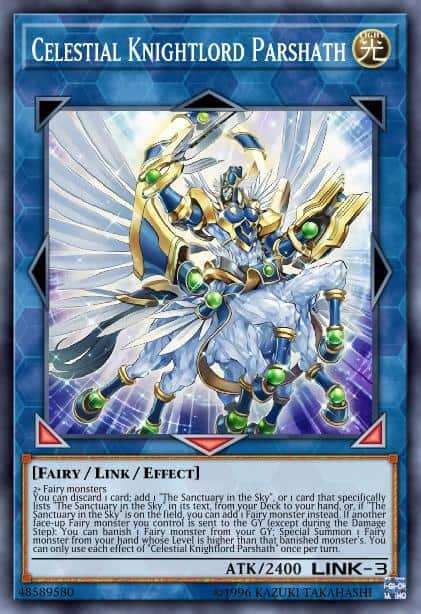 You can discard 1 card; add 1 “The Sanctuary in the Sky”, or 1 card that specifically lists “The Sanctuary in the Sky” in its text, from your Deck to your hand, or, if “The Sanctuary in the Sky” is on the field, you can add 1 Fairy monster instead. If another face-up Fairy monster you control is sent to the GY (except during the Damage Step): You can banish 1 Fairy monster from your GY; Special Summon 1 Fairy monster from your hand whose Level is higher than that banished monster’s. You can only use each effect of “Celestial Knightlord Parshath” once per turn.