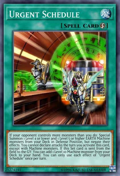 If your opponent controls more monsters than you do: Special Summon 1 Level 4 or lower and 1 Level 5 or higher EARTH Machine monsters from your Deck in Defense Position, but negate their effects. You cannot declare attacks the turn you activate this card, except with Machine monsters. If this Set card is sent from the field to the GY: You can add 1 Level 10 Machine monster from your Deck to your hand. You can only use each effect of “Urgent Schedule” once per turn.
