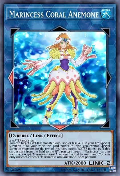You can target 1 WATER monster with 1500 or less ATK in your GY; Special Summon it to your zone this card points to, also you cannot Special Summon monsters for the rest of this turn, except WATER monsters. If this card is sent from the field to the GY: You can target 1 “Marincess” card in your GY, except “Marincess Coral Anemone”; add it to your hand. You can only use each effect of “Marincess Coral Anemone” once per turn.