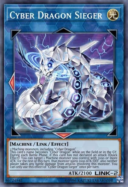 This card’s name becomes “Cyber Dragon” while on the field or in the GY. During each Battle Phase, if this card has not declared an attack (Quick Effect): You can target 1 Machine monster you control with 2100 or more ATK; for the rest of this turn, that monster gains 2100 ATK/DEF, also neither player takes any battle damage from attacks involving this monster. You can only use this effect of “Cyber Dragon Sieger” once per turn.