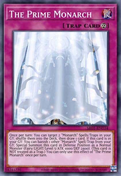 Once per turn: You can target 2 “Monarch” Spell/Trap Cards in your Graveyard; shuffle them into the Deck, then draw 1 card. If this card is in your Graveyard: You can banish 1 other “Monarch” Spell/Trap Card from your Graveyard; Special Summon this card in Defense Position as a Normal Monster (Fairy-Type/LIGHT/Level 5/ATK 1000/DEF 2400). (This card is NOT treated as a Trap Card.) You can only use this effect of “The Prime Monarch” once per turn.