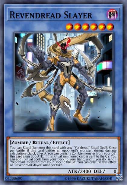 You can Ritual Summon this card with any “Vendread” Ritual Spell. Once per battle, if this card battles an opponent’s monster, during damage calculation (Quick Effect): You can banish 1 Zombie monster from your GY; this card gains 300 ATK. If this Ritual Summoned card is sent to the GY: You can add 1 Ritual Spell from your Deck to your hand, and if you do, send 1 “Vendread” monster from your Deck to the GY. You can only use this effect of “Revendread Slayer” once per turn.