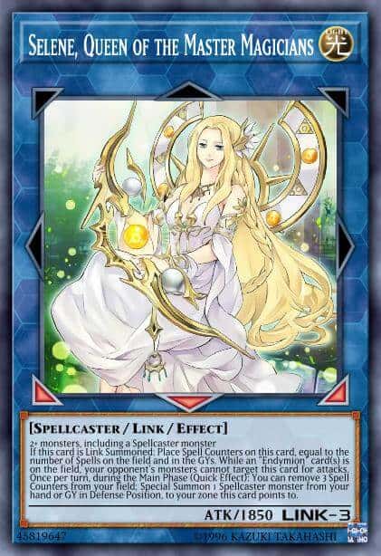 If this card is Link Summoned: Place Spell Counters on this card, equal to the number of Spells on the field and in the GYs. While an “Endymion” card(s) is on the field, your opponent’s monsters cannot target this card for attacks. Once per turn, during the Main Phase (Quick Effect): You can remove 3 Spell Counters from your field; Special Summon 1 Spellcaster monster from your hand or GY in Defense Position, to your zone this card points to.