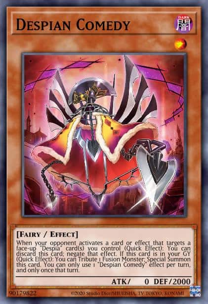 When your opponent activates a card or effect that targets a face-up “Despia” card(s) you control (Quick Effect): You can discard this card; negate that effect. If this card is in your GY (Quick Effect): You can Tribute 1 Fusion Monster; Special Summon this card. You can only use 1 “Despian Comedy” effect per turn, and only once that turn.