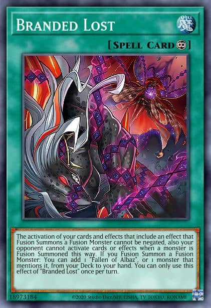 The activation of your cards and effects that include an effect that Fusion Summons a Fusion Monster cannot be negated, also your opponent cannot activate cards or effects when a monster is Fusion Summoned this way. If you Fusion Summon a Fusion Monster: You can add 1 “Fallen of Albaz”, or 1 monster that mentions it, from your Deck to your hand. You can only use this effect of “Branded Lost” once per turn.